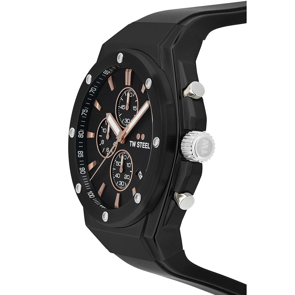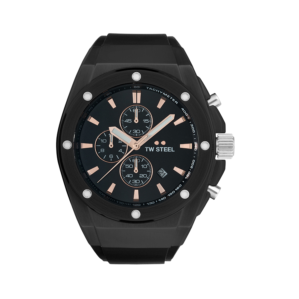 - High grade 316L PVD rose gold plated case and black plated bezel with shiny steel screw