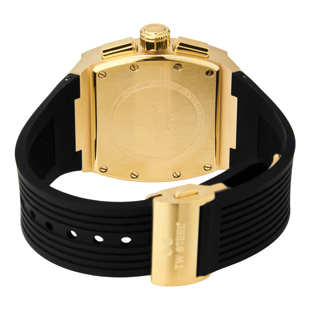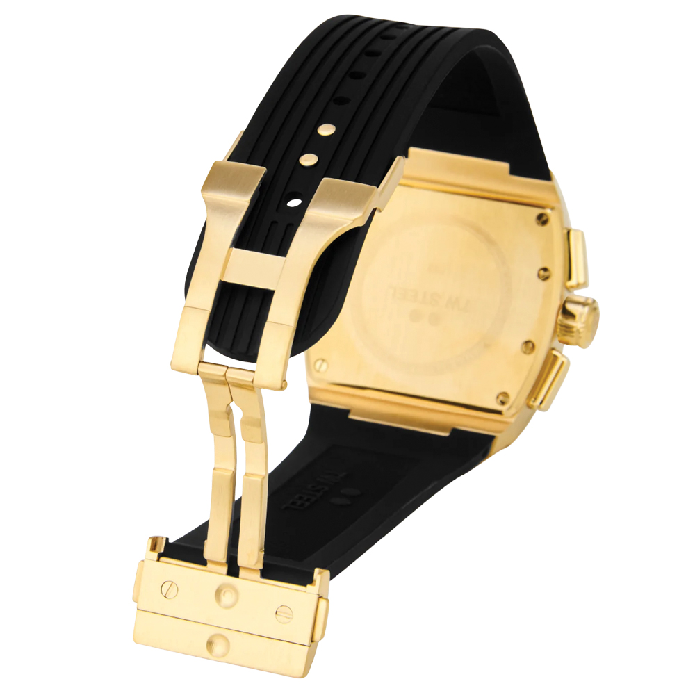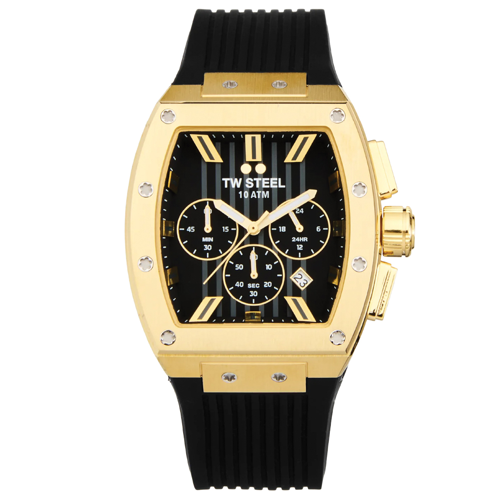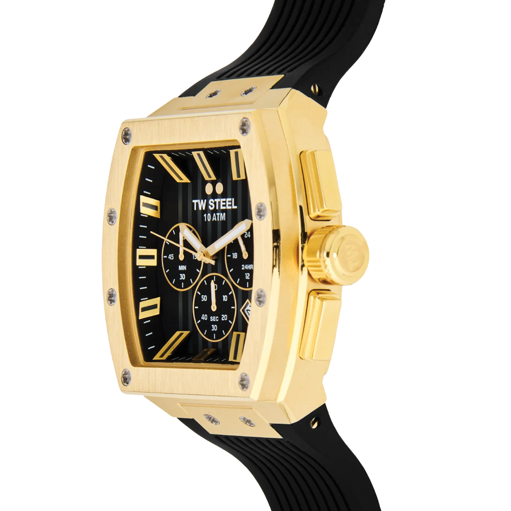 An elegant tonneau watch that never falls out of style. The TO2 features a chronograph with a PVD yellow gold case, a rubber black strap, 10 ATM and a 2-year global warranty.