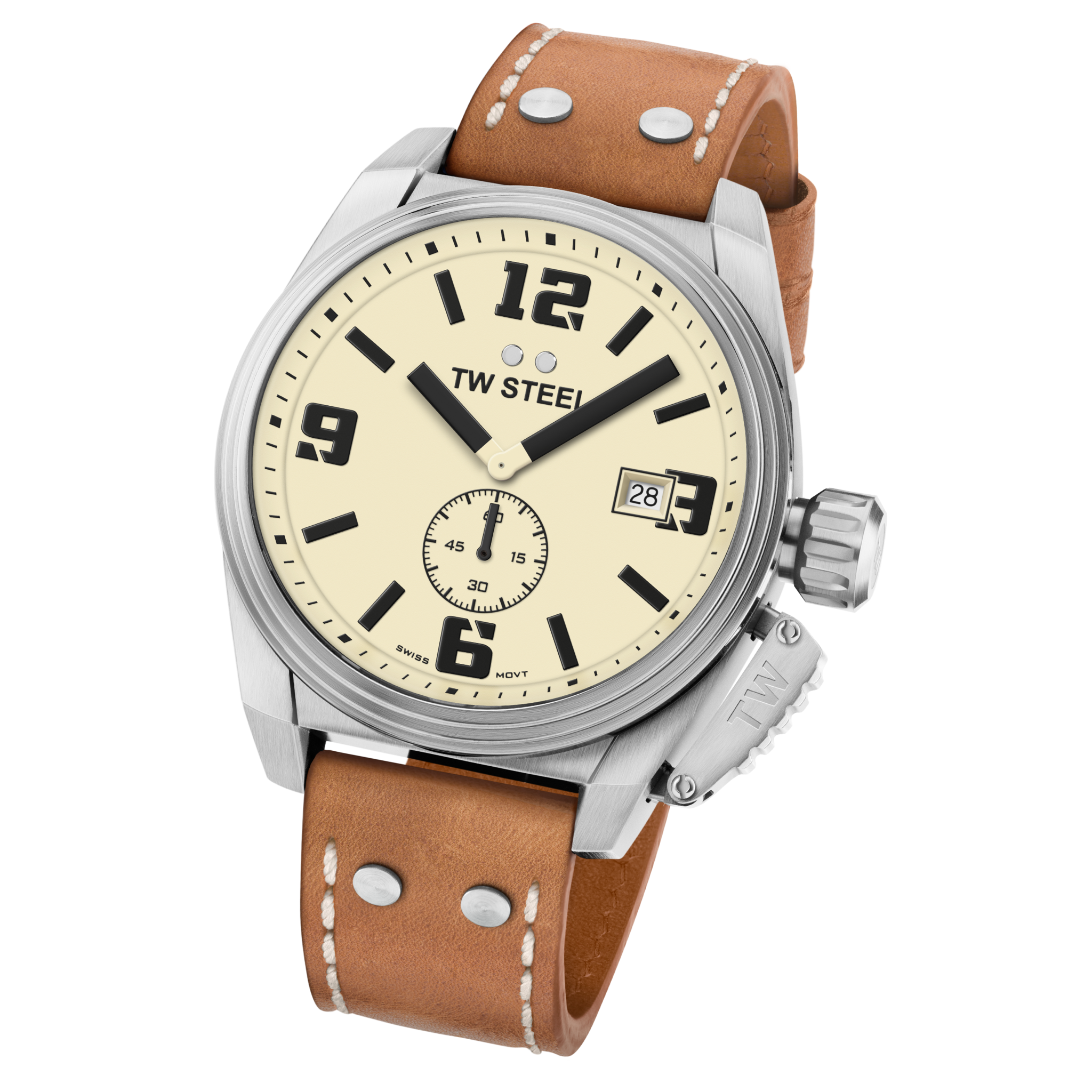 Original Canteen style timepiece with a fresh new look. The TW1000 is powered by a Swiss made movement and features a steel case with brushed bezel, anti-reflection sapphire crystal, a brown leather strap and long battery life.