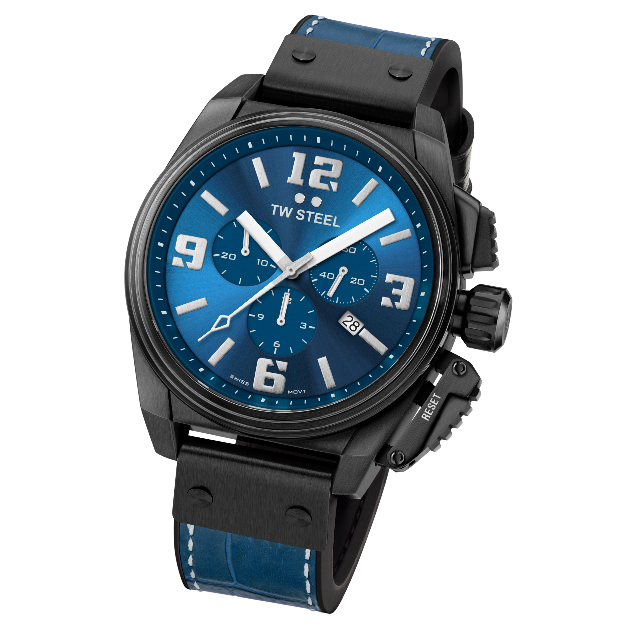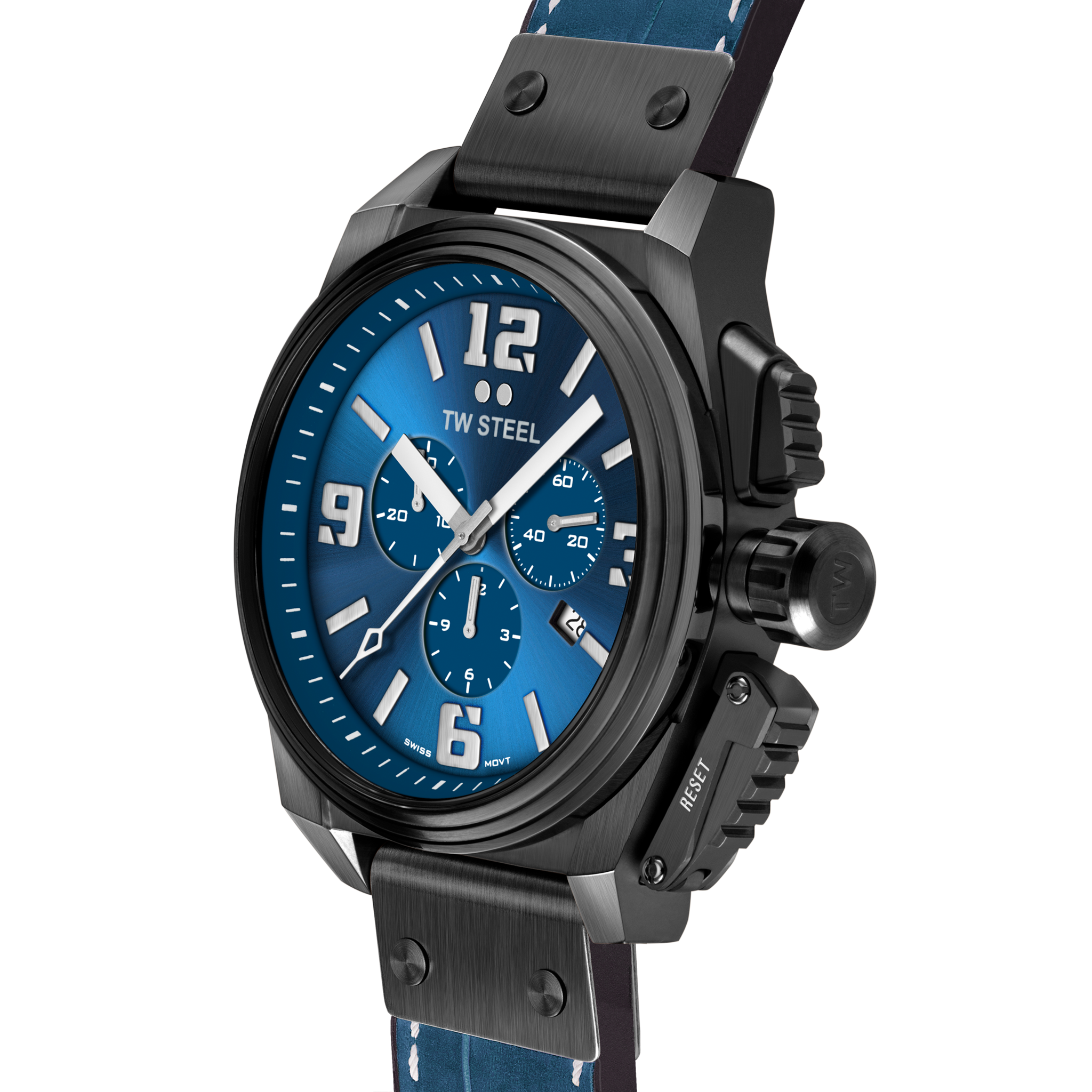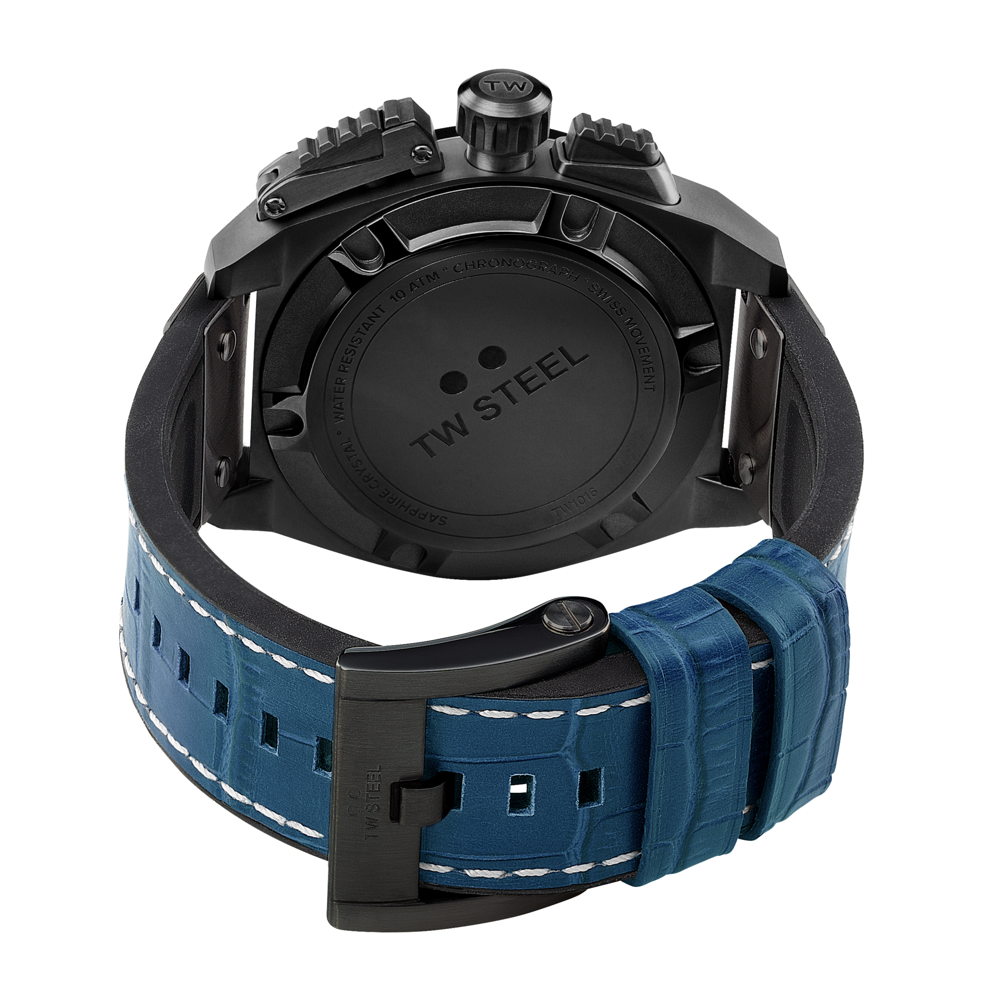 Original Canteen style timepiece with a fresh new look. The TW1016 is powered by a Swiss made chronograph movement and features a PVD brushed black coated case, anti-reflection sapphire crystal, a midnight blue croco leather on rubber strap and long battery life.