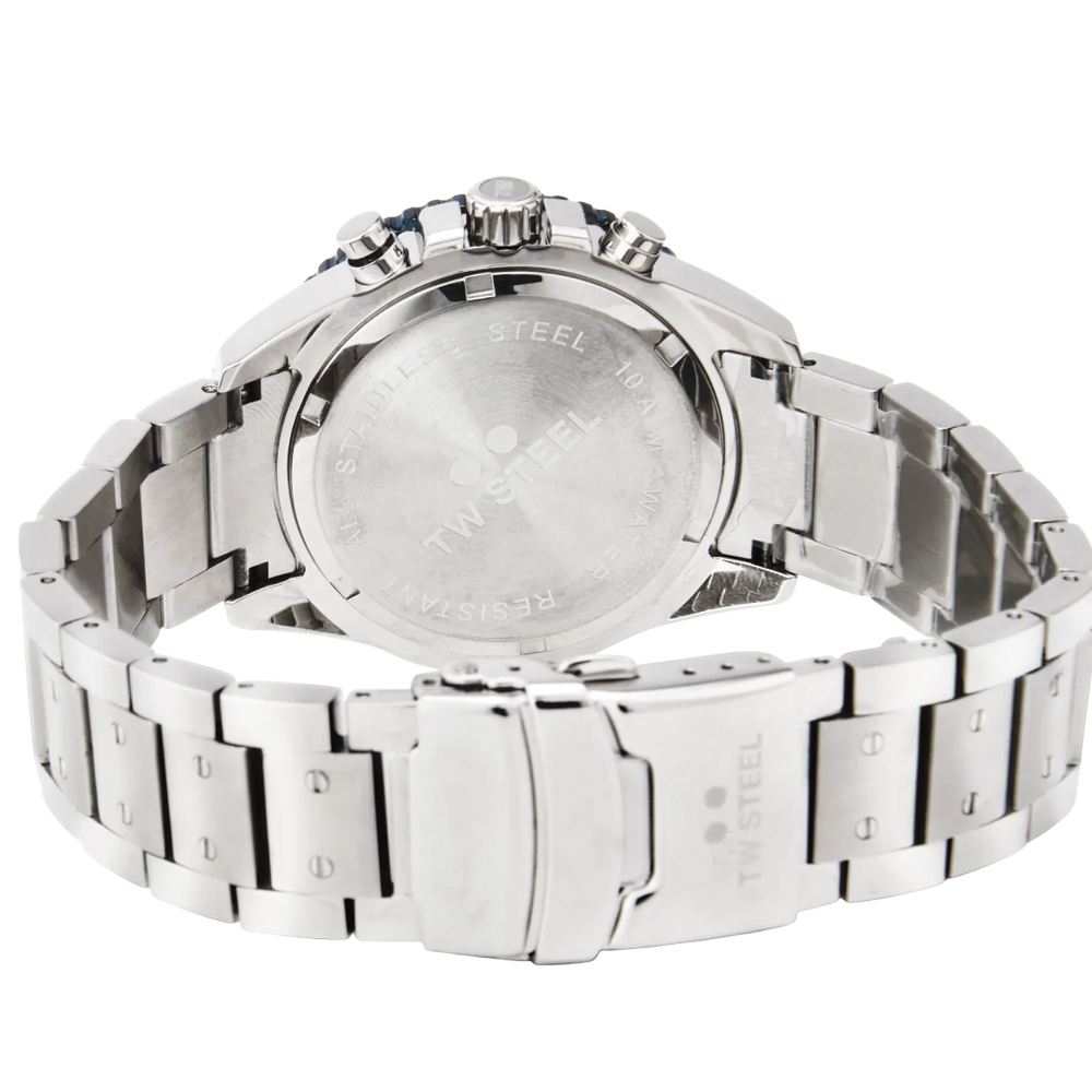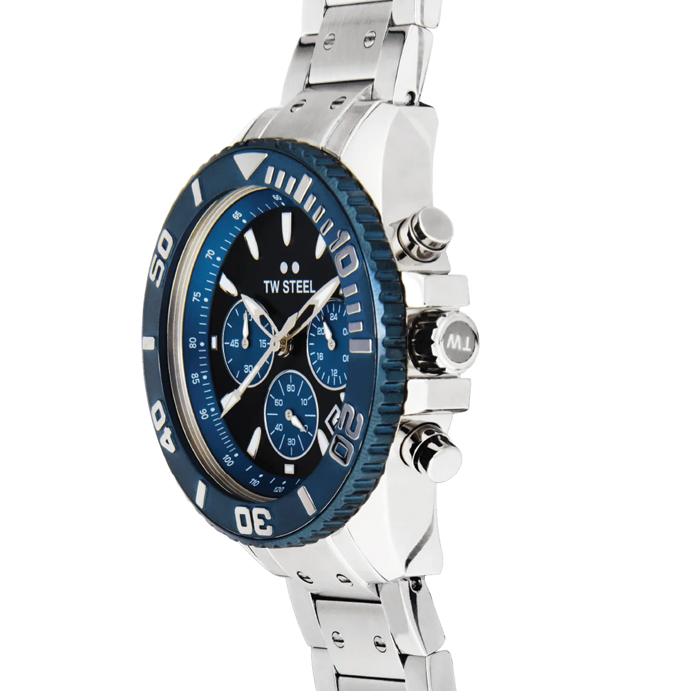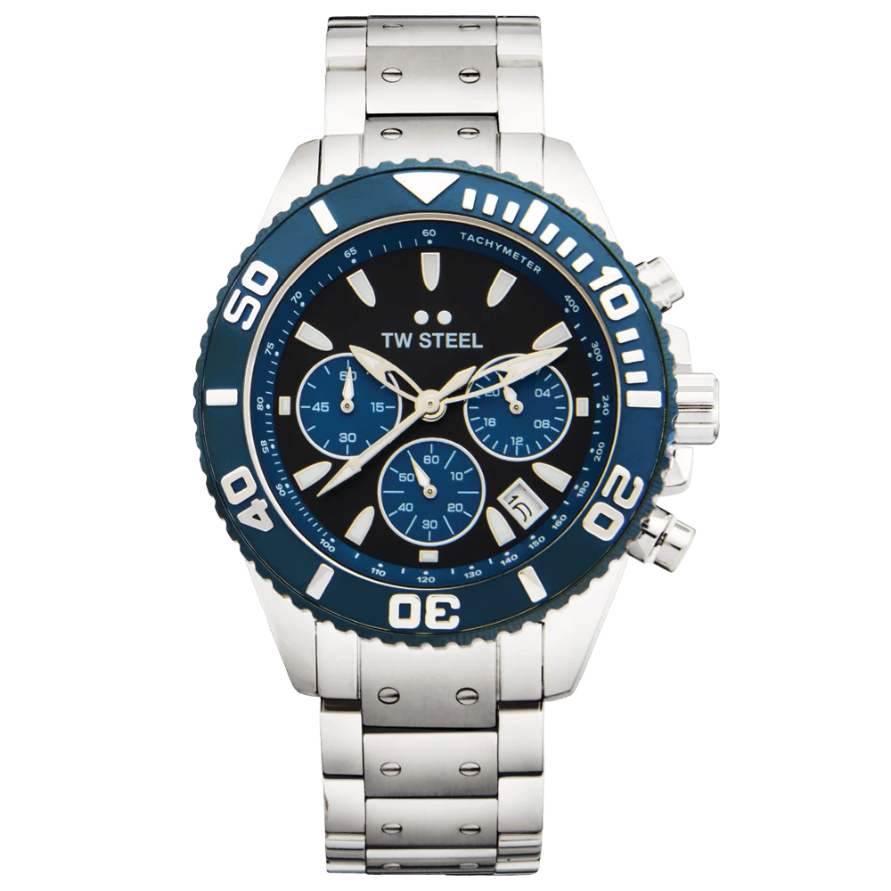 With the Vanceur Diver collection, TW Steel navigates in style. The VA6 features a chronograph with a shiny steel case, blue rotating diver bezel, a steel strap, 10 ATM and a 2-year global warranty.