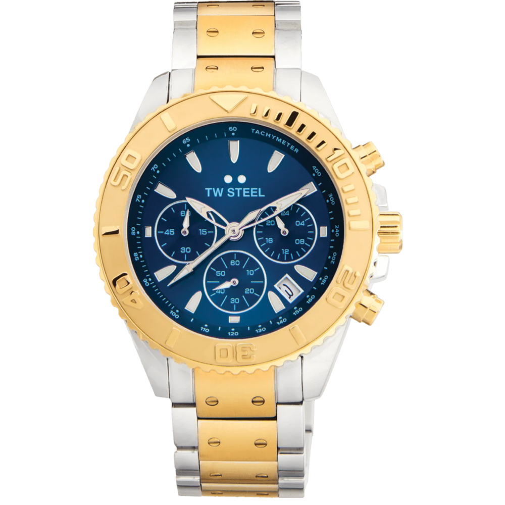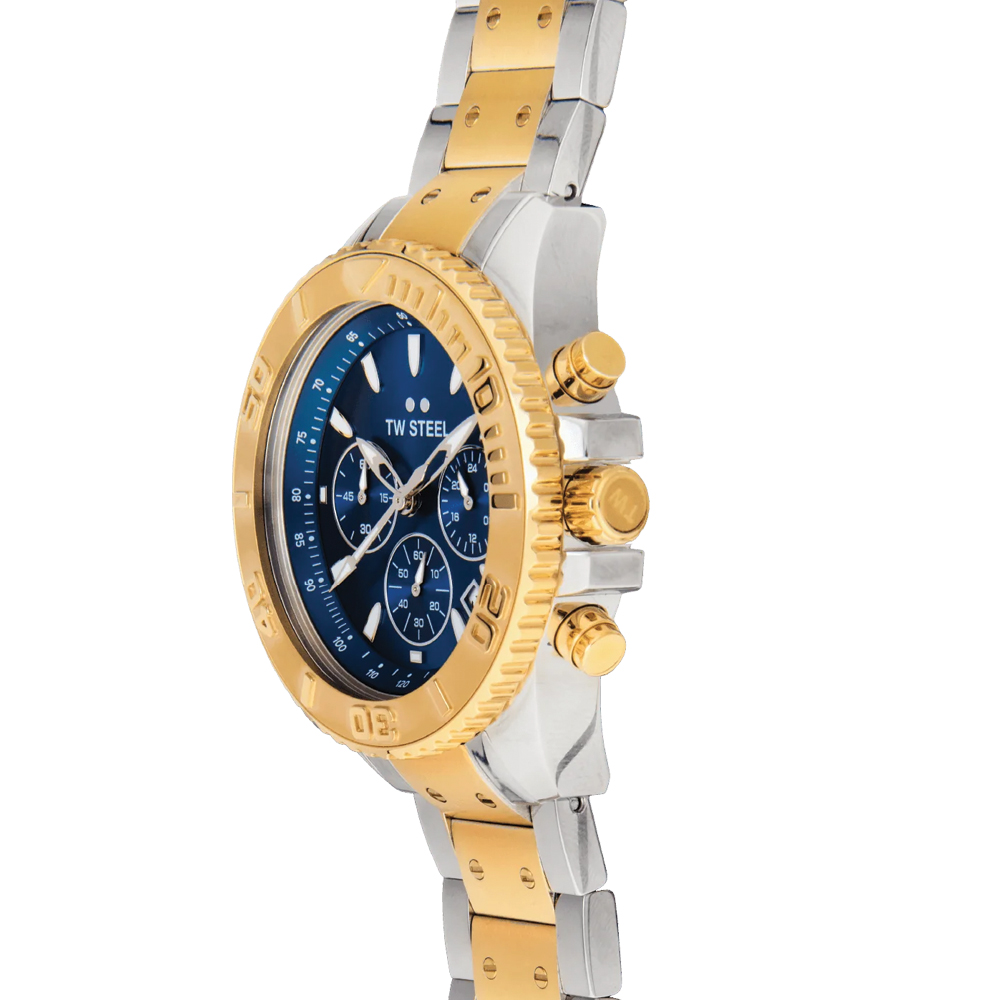With the Vanceur Diver collection, TW Steel navigates in style. The VA8 features a chronograph with a shiny steel case, yellowgold rotating diver bezel, a steel strap, 10 ATM and a 2-year global warranty.