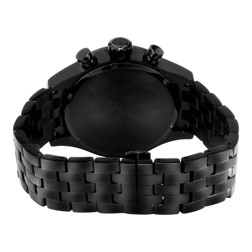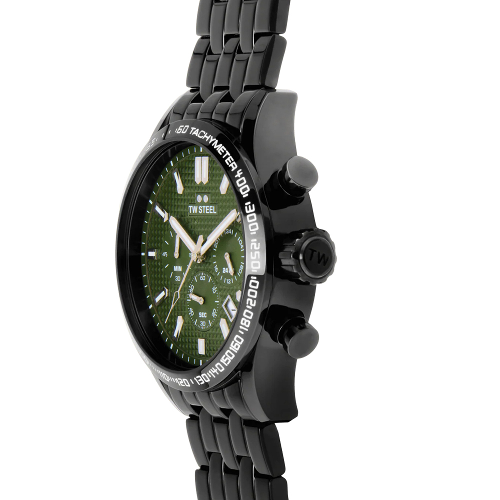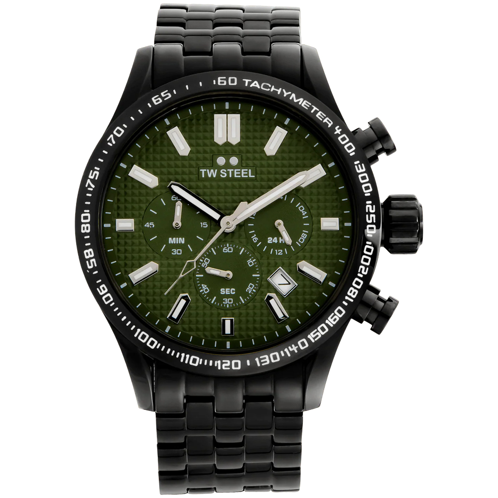 Make your move in steel. This VB3 comes with a green patterned dial, white numeral tachymeter, 45mm black PVD case and black PVD bracelet. VK63 chronograph.