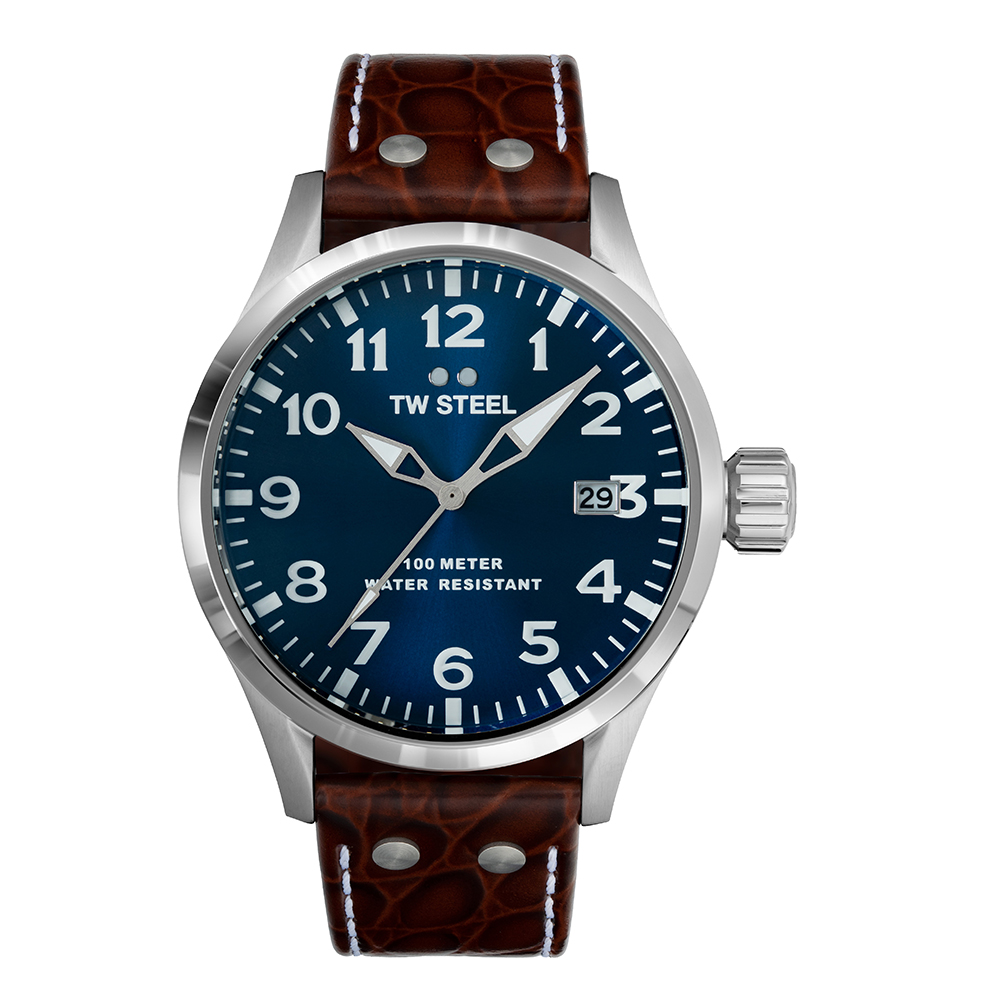 Go from A to Bold with this Volante watch. This VS101 features a 45mm steel case, a dark blue sunray dial and a brown croco leather strap.