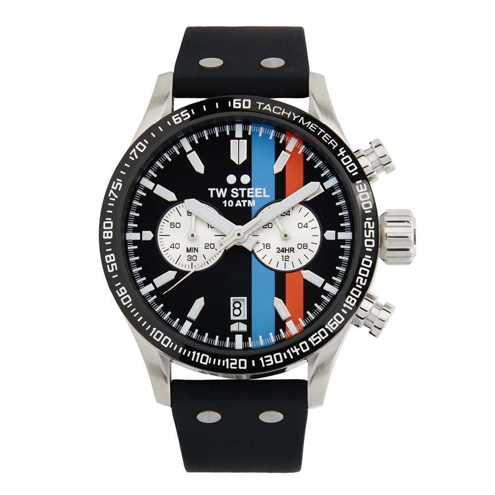 - Black satin chronograph with date and Iconic red & blue racing stripes