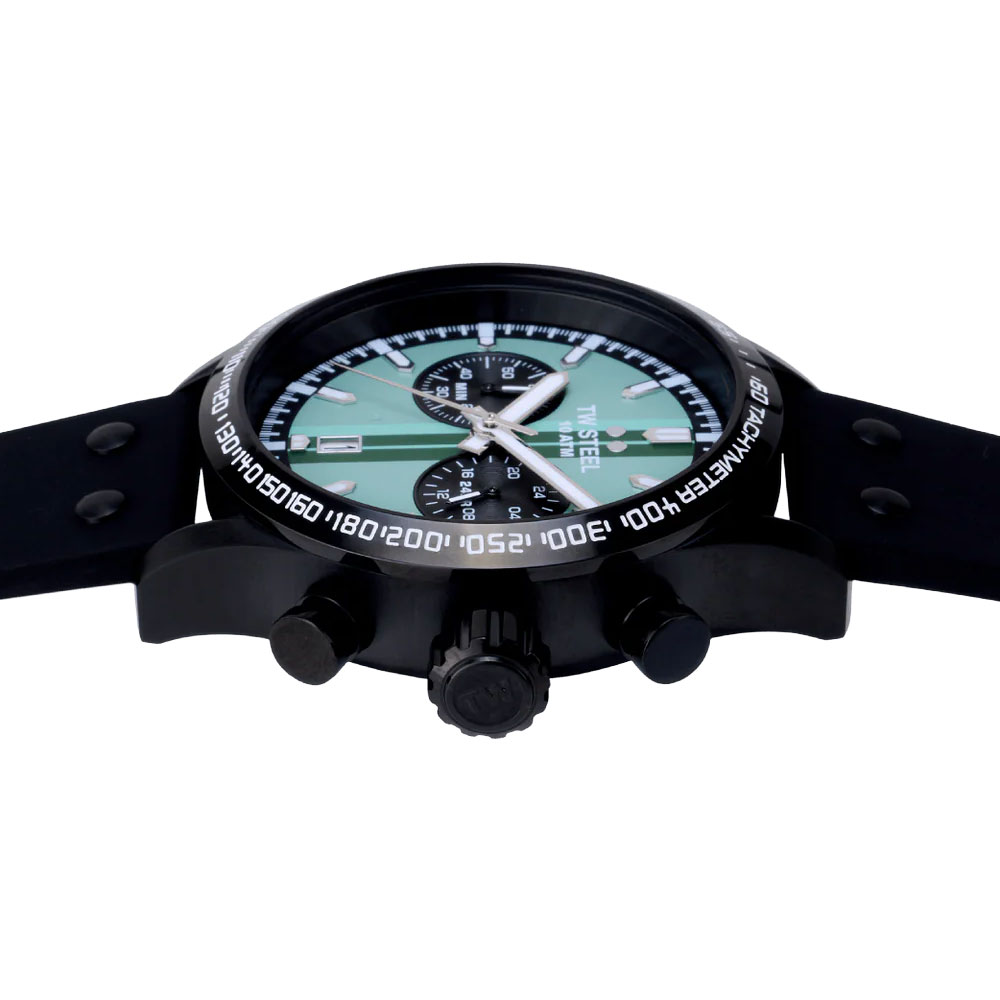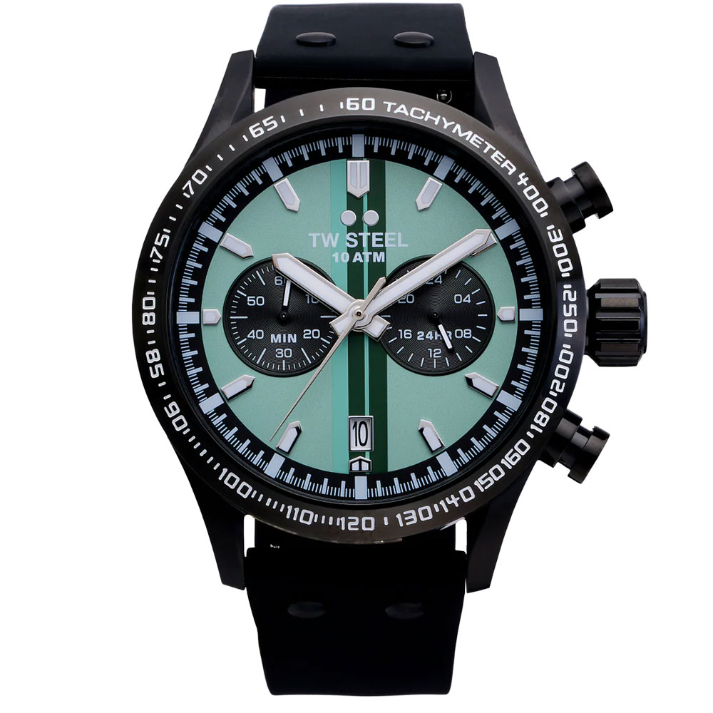 The new VS134 brings fresh energy to the Volante Sport collection. Featuring a mint green chronograph dial with racy striping, black case, tachymeter bezel, and black rubber strap, this 45mm watch combines bold attitude, precision, and everyday performance with unmistakable TW Steel confidence.